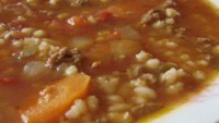 Brown the meat. Add water, onions, Worcestershire, ketchup, salt and basil. Simmer covered for 1 ½ hours. Add carrots & potatoes/turnip. Cook for 15-20 minutes until tender. Add peas and cook another 5 minutes. Thicken with flour or corn starch.